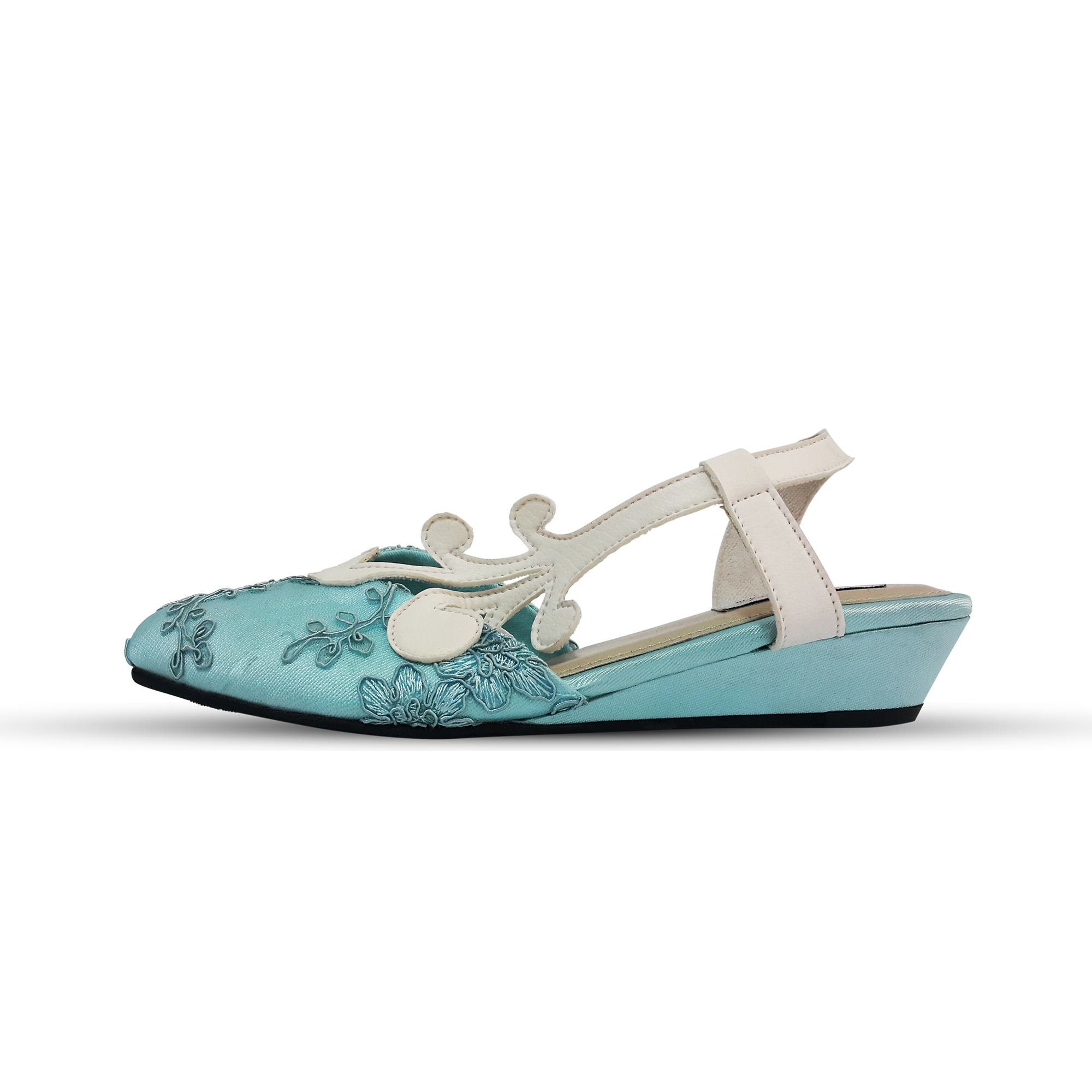 The sky is blue. Flats. A wedding shoe. Upper: Pure satin silk and lace. Lining: suede. Sole: rubber. Heels 4cm. Made in Indonesia .