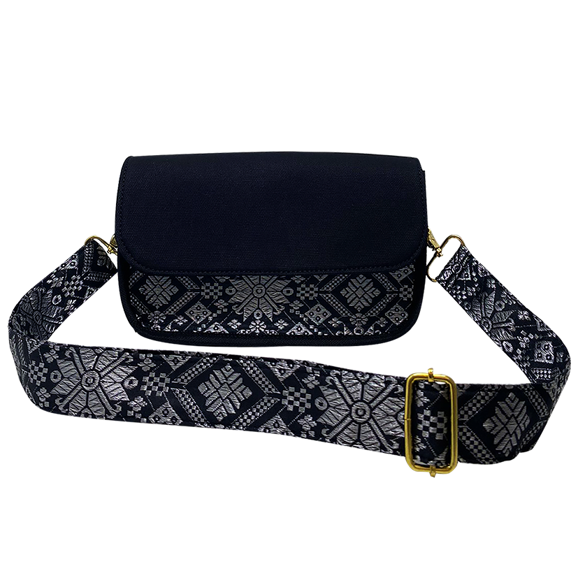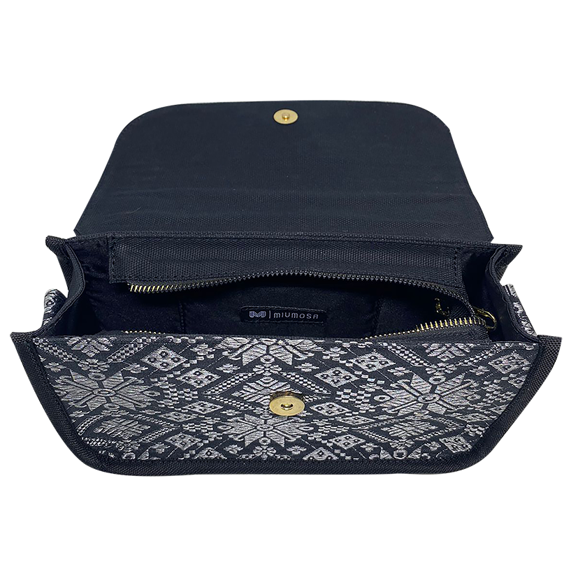 Danisa Klasik Songket Color: Black Length : L 25 x W 18 x H. 7 cm Card Slot: 1 slot Material: Songket ; canvas Adjustable Slingbag Accessories: Metal