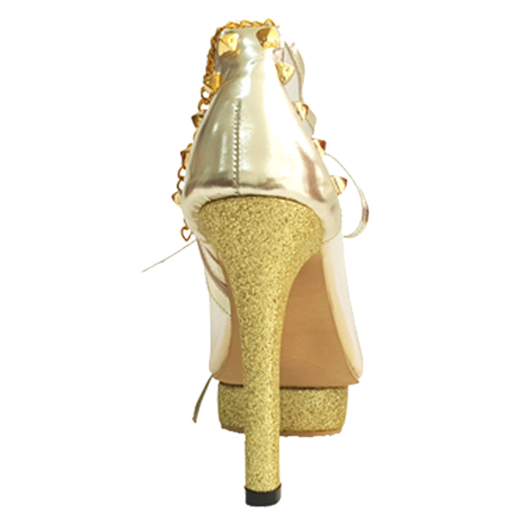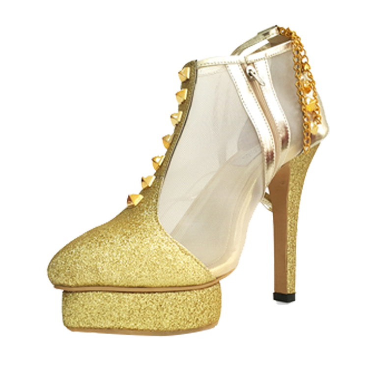 Sustainability Glam. Upper: Fishnet made of recycled plastic, glitter suede with a metal star details. Ankle boots with zippers. Lining: soft leather Sole: rubber Heels: 12 cm made in Indonesia