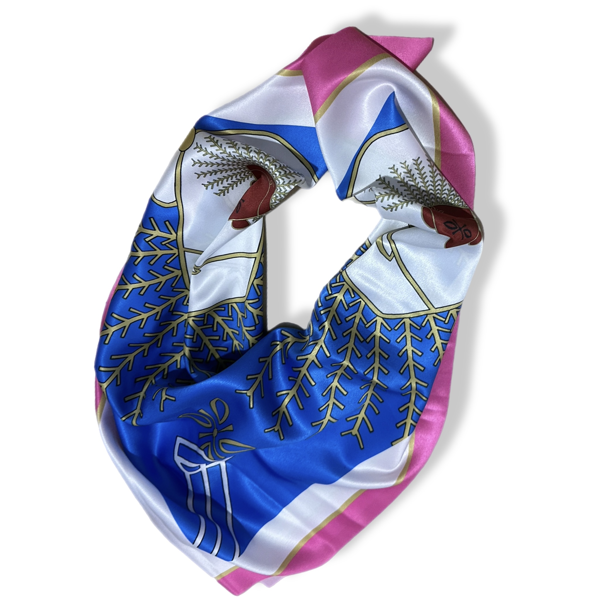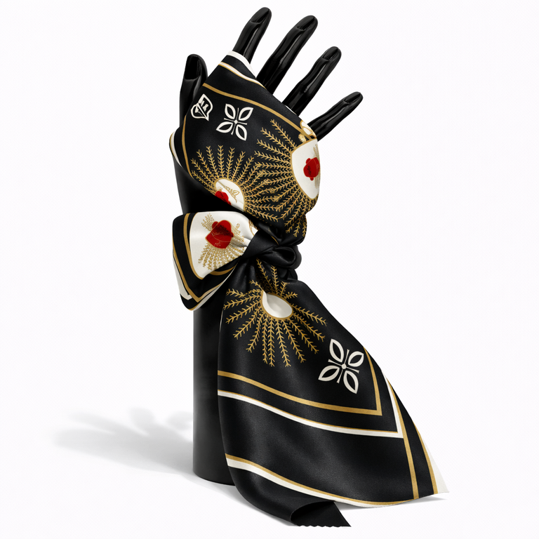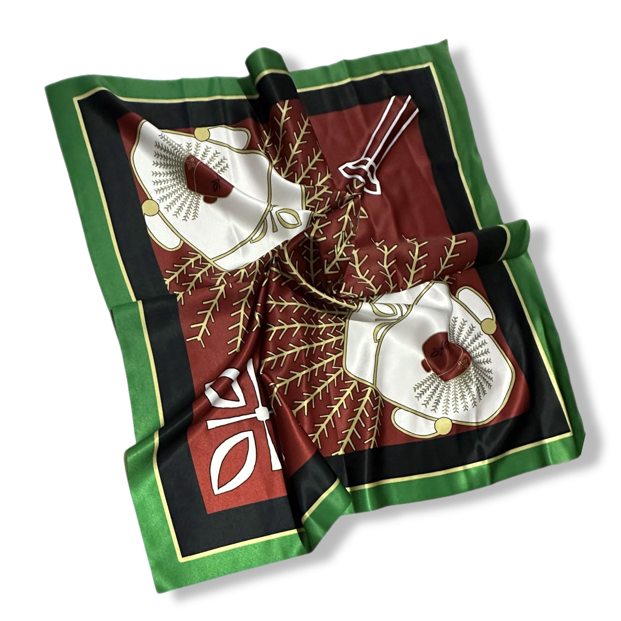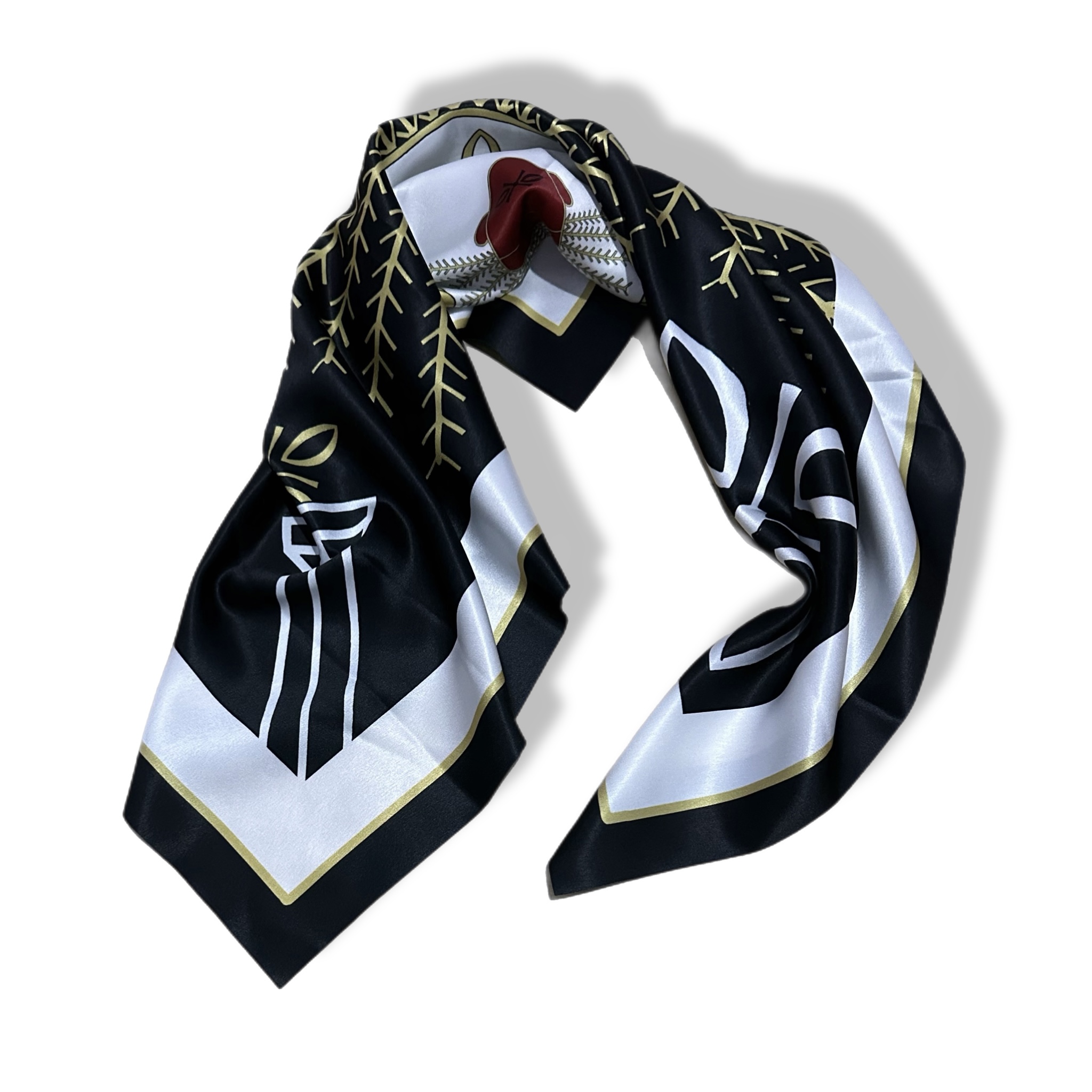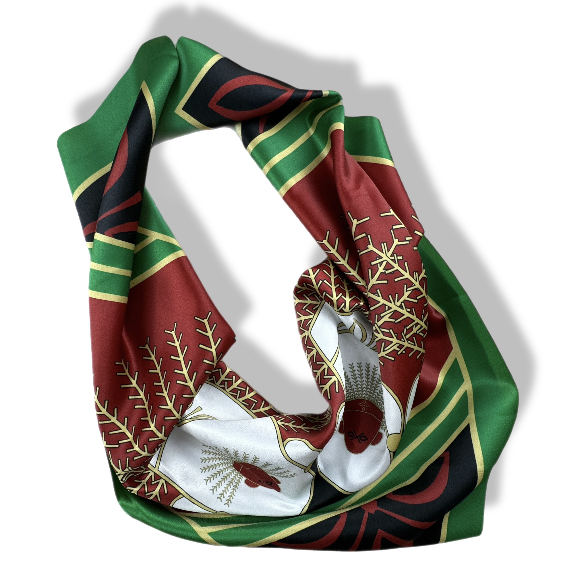 Budaya Silk Scarf Series. 498 Jakarta Edition. Jakarta is a city where history and culture pulse beneath the surface of its modern skyline, with the iconic Monas standing tall as a symbol of national pride and resilience. Beneath the golden flame, the intricate art of kembang kelapa adorns traditional celebrations—its blooming form a symbol of hope and enduring spirit. On the streets, a pair of Ondel-ondel dancers dance to the rhythm of tanjidor music, echoing the spirit of ancient guardians in a vibrant, living tradition. Budaya Silk Scarf is an exclusive series that celebrates the spirit of Indonesia’s 38 provinces, with each design telling a unique story — a visual symphony of culture, identity, and enduring beauty. Satin Silk 70 x 70 cm. Color: White, Black, Blue, and Green