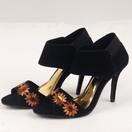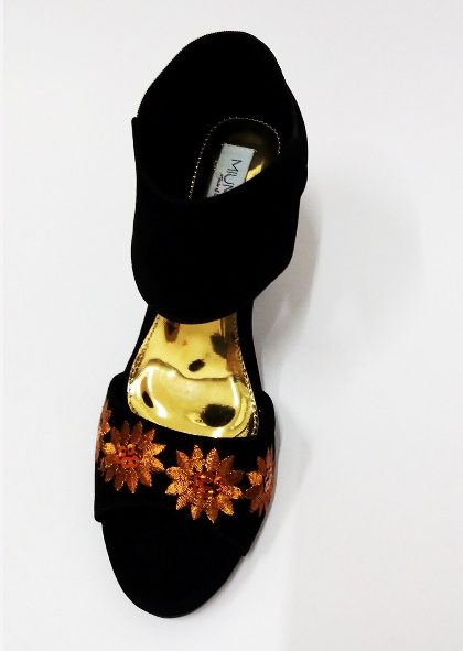 Open-toe-ankle strap shoe featuring gold sprouting bloom chrysanthemum embellished.