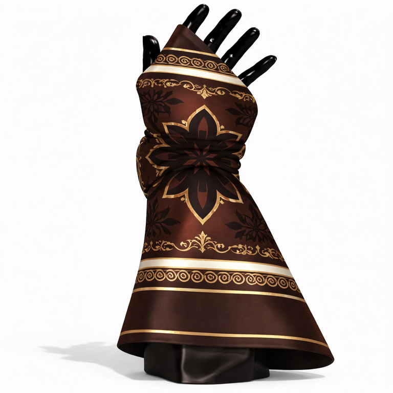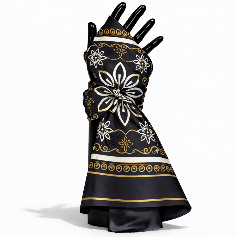 Conceived as a portable vessel of that interior gold, the scarf translates mythology into surface and movement. Spiraling motifs echo the geometry of the shell, while restrained lines of gold articulate permanence without excess. Silk becomes both medium and metaphor — supple yet tensile, luminous yet composed — allowing concealment and revelation to coexist with each fold. Here, adornment is not embellishment but essence made tactile: a quiet sovereignty carried close to the body.